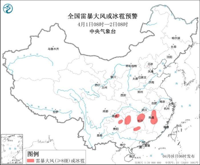 全國雷暴大風(fēng)或冰雹預(yù)警(4月1日08時-2日08時)