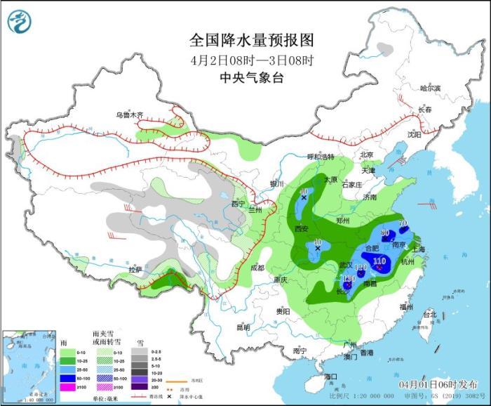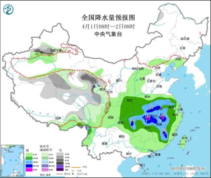 4月1日08時至2日08時,新疆沿天山地區(qū)和南疆盆地、西藏北部和東部、青海大部、川西高原北部等地部分地區(qū)有小到中雪或雨夾雪,其中,新疆沿天山地區(qū)和南疆盆地、青海東北部等地部分地區(qū)有大到暴雪,新疆沿天山地區(qū)局地大暴雪(20~21毫米)。陜西東南部、河南中南部、安徽大部、江蘇中西部、四川東部、重慶大部、貴州東北部、湖北、湖南中北部、江西大部、浙江中西部、福建中西部等地部分地區(qū)有中到大雨,其中,河南南部、安徽中南部、湖北東部和南部、湖南北部和西部、江西北部和東南部、福建西部、重慶東南部等地部分地區(qū)有暴雨,局地大暴雨(100~120毫米)。內(nèi)蒙古西北部、新疆東部、青海西部、甘肅河西等地部分地區(qū)有4~6級風(fēng),其中,新疆東部部分地區(qū)有7~8級風(fēng),山口風(fēng)力可達11級以上。