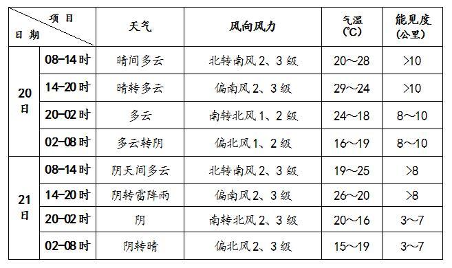 21日傍晚可能出現(xiàn)雷陣雨天氣,雨量不大,請關(guān)注最新天氣預(yù)報;大部分時間體感舒適,但晝夜溫差較大,早晨體感偏涼,午后偏熱,請根據(jù)氣溫變化及時調(diào)整著裝,以防感冒。