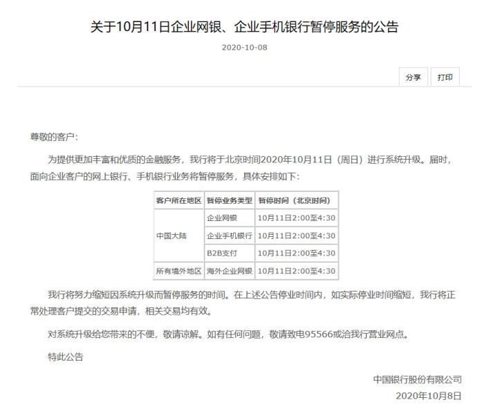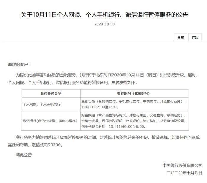 中新網(wǎng)客戶端10月10日電(彭婧如)近日,中國銀行先后發(fā)布《關(guān)于10月11日企業(yè)網(wǎng)銀、企業(yè)手機銀行暫停服務(wù)的公告》、《關(guān)于10月11日個人網(wǎng)銀、個人手機銀行、微信銀行暫停服務(wù)的公告》。根據(jù)公告,中國銀行將于北京時間2020年10月11日(周日)進(jìn)行系統(tǒng)升級。屆時,面向企業(yè)客戶的網(wǎng)上銀行、手機銀行業(yè)務(wù)將暫停服務(wù),個人網(wǎng)銀、個人手機銀行、微信銀行服務(wù)功能也將暫停使用。