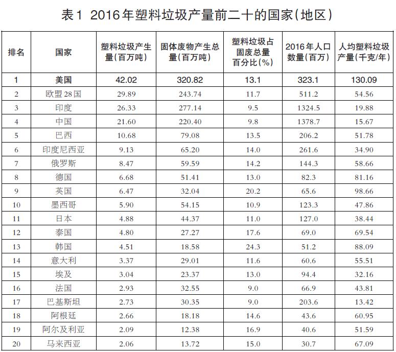 對(duì)比兩次研究結(jié)果發(fā)現(xiàn),從2010年到2016年,全球塑料生產(chǎn)量從3.34億噸增加到了4.22億噸,增加了26%,全球塑料垃圾占固體廢物的比例從10%上漲到了12%,2016年全球塑料垃圾達(dá)到了2.42億噸。從2016年每個(gè)國(guó)家產(chǎn)生的垃圾量(表1)看出,美國(guó)產(chǎn)生的固體廢物總量、塑料垃圾總量以及人均塑料垃圾產(chǎn)量(超過100千克)均為世界最多。相比之下,中國(guó)的人均塑料垃圾生產(chǎn)量?jī)H為美國(guó)的20%。歐盟28國(guó)作為一個(gè)整體,雖然總?cè)丝谥挥杏《然蛑袊?guó)人口的40%,產(chǎn)生的塑料垃圾總量比印度或中國(guó)都要多。但即便在歐盟,人均塑料垃圾產(chǎn)量也不到美國(guó)的一半。