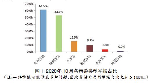 從污染類型來看,10月大氣污染舉報(bào)最多,占舉報(bào)總量的61.5%,該占比比9月同類占比減少1.5%。其次為噪聲污染舉報(bào),占舉報(bào)總量的53.3%。水污染、固廢污染、生態(tài)破壞和輻射污染舉報(bào)分別占舉報(bào)總量的15.5%、9.4%、3.4%和0.7%。