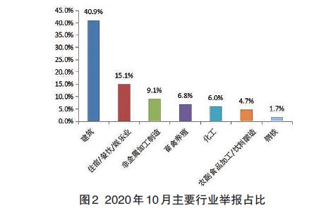 從行業(yè)類型來看,10月公眾反映最集中的行業(yè)為建筑業(yè),占40.9%;其次為住宿餐飲娛樂業(yè)和非金屬加工制造業(yè),分別占15.1%和9.1%。其中,建筑業(yè)占比比9月同類占比增加1.8%;非金屬加工制造業(yè)舉報(bào)占比比9月同類占比增加2.1%;住宿餐飲娛樂業(yè)舉報(bào)占比比9月同類占比減少0.3%,化工行業(yè)舉報(bào)占比比9月同類占比減少2.6%。