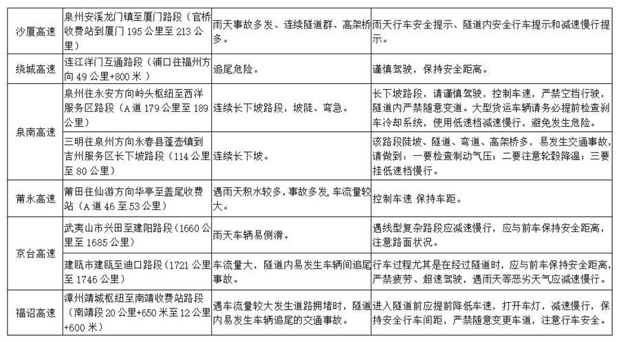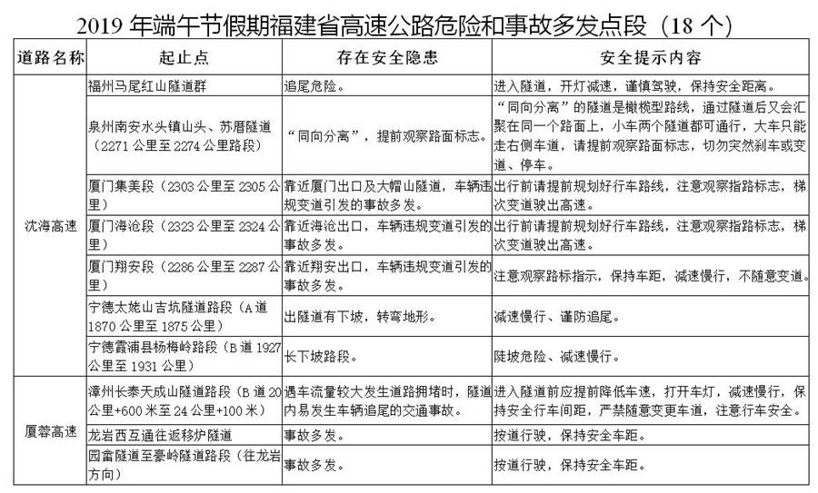 端午節(jié)假期福建各地高速公路危險(xiǎn)和事故多發(fā)點(diǎn)段18個(gè)、易擁堵路段13個(gè),管制路段1個(gè),如下——