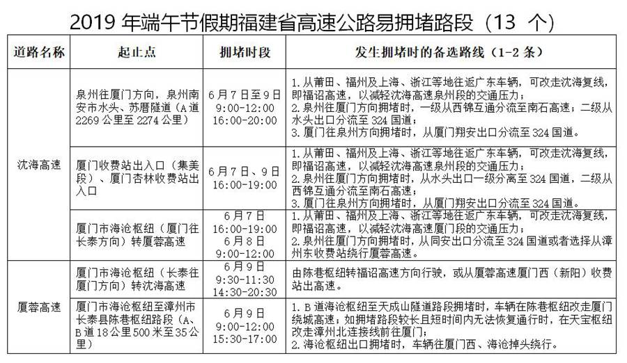 人民網(wǎng)福州6月5日電(余杉芳)來(lái)自福建省公安廳交警總隊(duì)的消息,2019年端午節(jié)假期為6月7日至9日,恰逢全國(guó)高考期間,相比清明、五一等節(jié)假日,高速公路網(wǎng)運(yùn)行壓力較小,但車流量較平時(shí)會(huì)有明顯增加,部分路段車流量“潮汐”現(xiàn)象明顯。交警總隊(duì)發(fā)布了端午節(jié)假期福建各地高速行車安全提示,同時(shí)公布高速公路危險(xiǎn)和事故多發(fā)點(diǎn)段有18個(gè)、易擁堵路段有13個(gè),管制路段有1個(gè)。