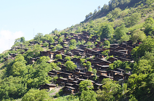 依山而建的木楞房錯(cuò)落有致地密布在半山腰上,村口整齊停放著一輛輛貨車(chē)、小汽車(chē)和摩托車(chē),通往各家的小路干凈整潔。