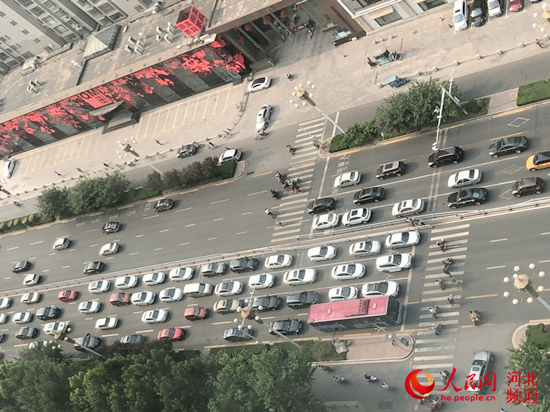 6月12日上午8時(shí)許,正值上班高峰期,石家莊市區(qū)主干道裕華路上,人多車多。裕華路與體育大街交口往東,北側(cè)是劍橋春雨小區(qū),南側(cè)是方北小區(qū),兩個(gè)小區(qū)門口正對(duì)裕華路的半幅機(jī)動(dòng)車道上分別畫著斑馬線。因?yàn)楦浇袑W(xué)校,南北兩側(cè)陸陸續(xù)續(xù)有送孩子的家長(zhǎng)或騎車人從斑馬線通過裕華路。每當(dāng)有人通過斑馬線時(shí),裕華路上的汽車都會(huì)停下來等候。由于行人三五成群,不斷通過,路上的汽車不得不繼續(xù)等候,以至于排起了長(zhǎng)龍。