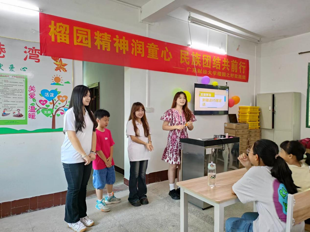 7月7日-7月13日,廣東財經(jīng)大學(xué)“榴園之籽”實踐團(tuán)組織了廣財大的各民族精英大學(xué)生到興寧市開展鄉(xiāng)村支教活動,隊員們教授民族特色歌舞、繪畫手工、武術(shù)體育和勞動教育等內(nèi)容,助力兒童德智體美勞全面發(fā)展。隊員們還為兒童展示各民族的文化特色,讓他們感受到不同民族文化的魅力,并通過講述廣東人民援疆、援藏的事跡,特別是“榴園”校友黃海芬扎根西藏奉獻(xiàn)的事跡,引導(dǎo)孩子們鑄牢中華民族共同體意識。隊員們在支教中傳遞“榴園精神”,鼓勵孩子們一起學(xué)習(xí)“凝心聚力、團(tuán)結(jié)奮斗”的“榴園精神”,激勵他們勤奮向?qū)W、學(xué)會感恩,長大成才后回饋家鄉(xiāng)和社會。