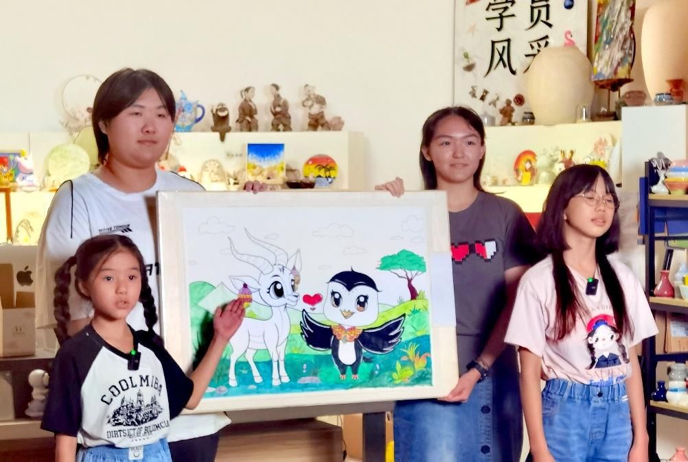 活動(dòng)期間,北京的劉心語、吳梓菡、文藝、吳辰希與西藏的旦增雍措、旦增尼瑪、徐杰、索朗央珍等兩地青少年代表,通過“同繪一幅畫”的方式,將西藏的藏羚羊與北京的雨燕巧妙地融合在一個(gè)畫面之中。畫作中,一邊是象征北京自由與活力的“空中旅行家”雨燕在無邊的藍(lán)天中翱翔,另一邊則是代表西藏堅(jiān)韌與生機(jī)的藏羚羊在遼闊的無人區(qū)自由奔跑。盡管兩者習(xí)性迥異、棲息地不同,它們共同展現(xiàn)了自由無束的特質(zhì),寓意著京藏兩地青少年盡管生活在不同的文化環(huán)境中,卻都能追求自由和快樂的成長。正如北京的孩子們說:“我們把來自拉薩的藏羚羊和來自北京的小雨燕聚集到一起,畫在了一個(gè)畫面中。看:藏羚羊戴著藏族耳飾,小雨燕身著云領(lǐng)服飾,她們是盛裝出席啊。就像我們,北京和西藏的同學(xué)們,手拉著手,心連著心,書信往來,學(xué)習(xí)探究,相互幫助,一起成長?!蔽鞑氐暮⒆诱f:“我們就像畫中的藏羚羊和北京雨燕一樣,心手相牽,互相鼓舞,用積極的態(tài)度學(xué)習(xí)、生活,成為祖國的好少年!”。