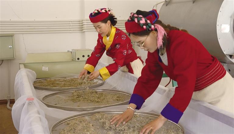 莓茶加工廠內(nèi)忙碌的工作人員。