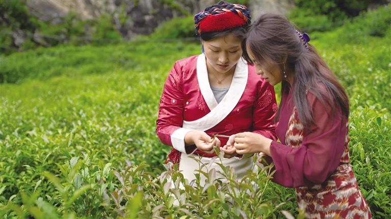 門巴族姑娘身著傳統(tǒng)服飾采茶。