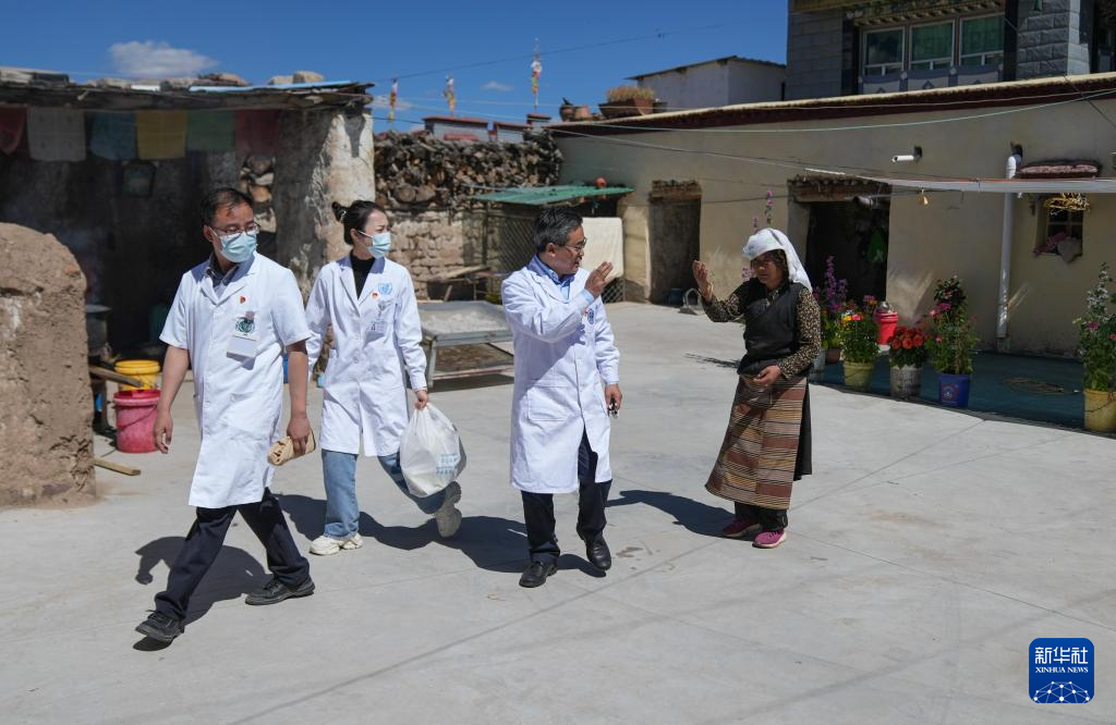 8月30日,熊海醫(yī)生(后右)和強(qiáng)嘎鄉(xiāng)衛(wèi)生院的康卓桑姆一同為患者檢查身體??底可D吩俏鞑卮髮W(xué)醫(yī)學(xué)院學(xué)生,在這次義診中又碰到了曾經(jīng)的老師。新華社記者 晉美多吉 攝