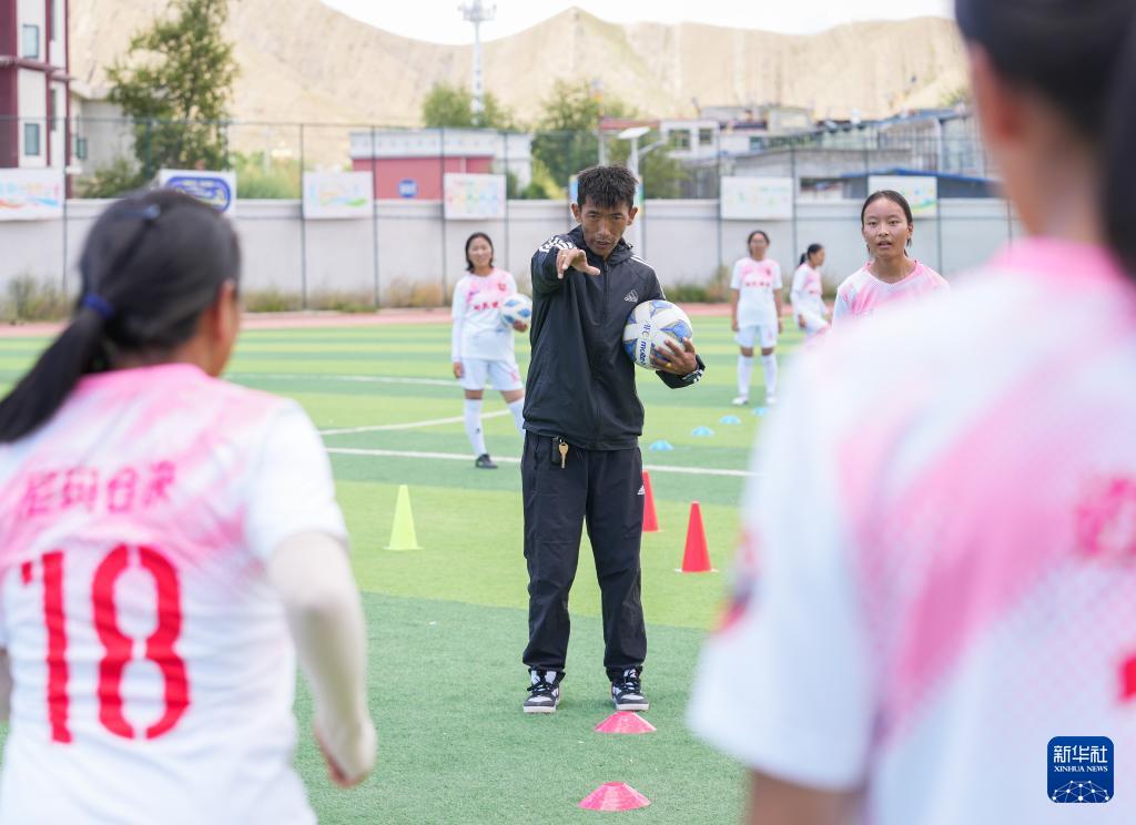 西藏日喀則市上海實(shí)驗(yàn)學(xué)?!爸榉逖棥迸幼闱蜿?duì)教練洛布桑在操場(chǎng)上指導(dǎo)球員訓(xùn)練(9月3日攝)。