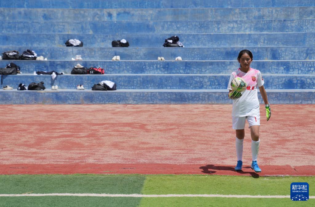 在西藏日喀則市上海實(shí)驗(yàn)學(xué)校,“珠峰雪鷹”女子足球隊(duì)守門(mén)員邊普在操場(chǎng)上訓(xùn)練(9月3日攝)。