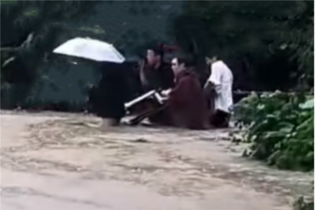 由于連續(xù)降雨,老人家中附近道路地勢低洼,蹣跚趕到時,已經(jīng)水勢及腰。吳明輝趕忙和村民一起將老人抬至安全地帶。老人順利脫險。