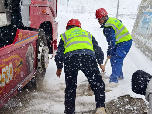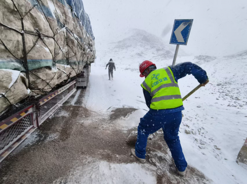 事發(fā)時(shí),強(qiáng)降雪導(dǎo)致路面濕滑,卡車在行駛過程中出現(xiàn)打滑,甚至有滑坡的風(fēng)險(xiǎn)。駕駛員在緊急制動(dòng)過程中,車輛失控,險(xiǎn)象環(huán)生。在這危急關(guān)頭,途經(jīng)此地的中交建設(shè)者們毫不猶豫地伸出援手。他們冒著嚴(yán)寒,鋪設(shè)碎石、沙子增加道路摩擦力。經(jīng)過一番艱苦努力,物資車輛終于緩緩駛離險(xiǎn)境。