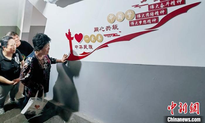 “樓里的每一處設(shè)計,都凝聚著各族居民的智慧?!睆埞葐谈锌瑥臉桥茦?biāo)語到過道裝飾,居民們?nèi)虆⑴c設(shè)計,樓道里的每句標(biāo)語都表達著他們心聲。