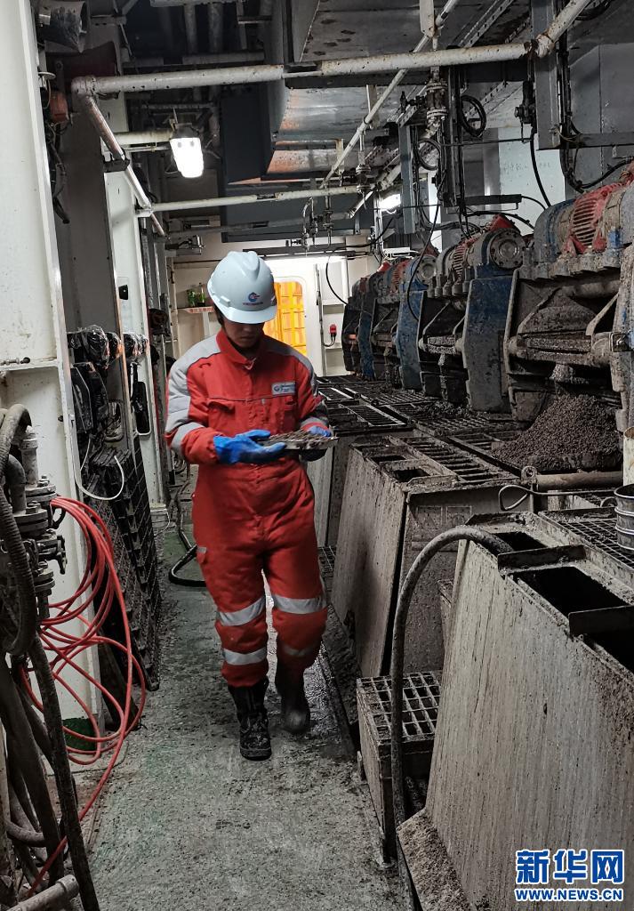 中國(guó)海油員工羅松巴登正在采集底層巖石樣本。(受訪者供圖)