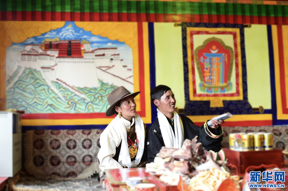 9月12日,村民堅參羅布(右)和妻子在看電視。新華網 旦增努布攝