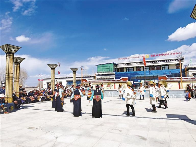 圖為上海援藏打造的鄉(xiāng)村振興示范點——江孜縣索蓋村,群眾載歌載舞慶祝新生活。