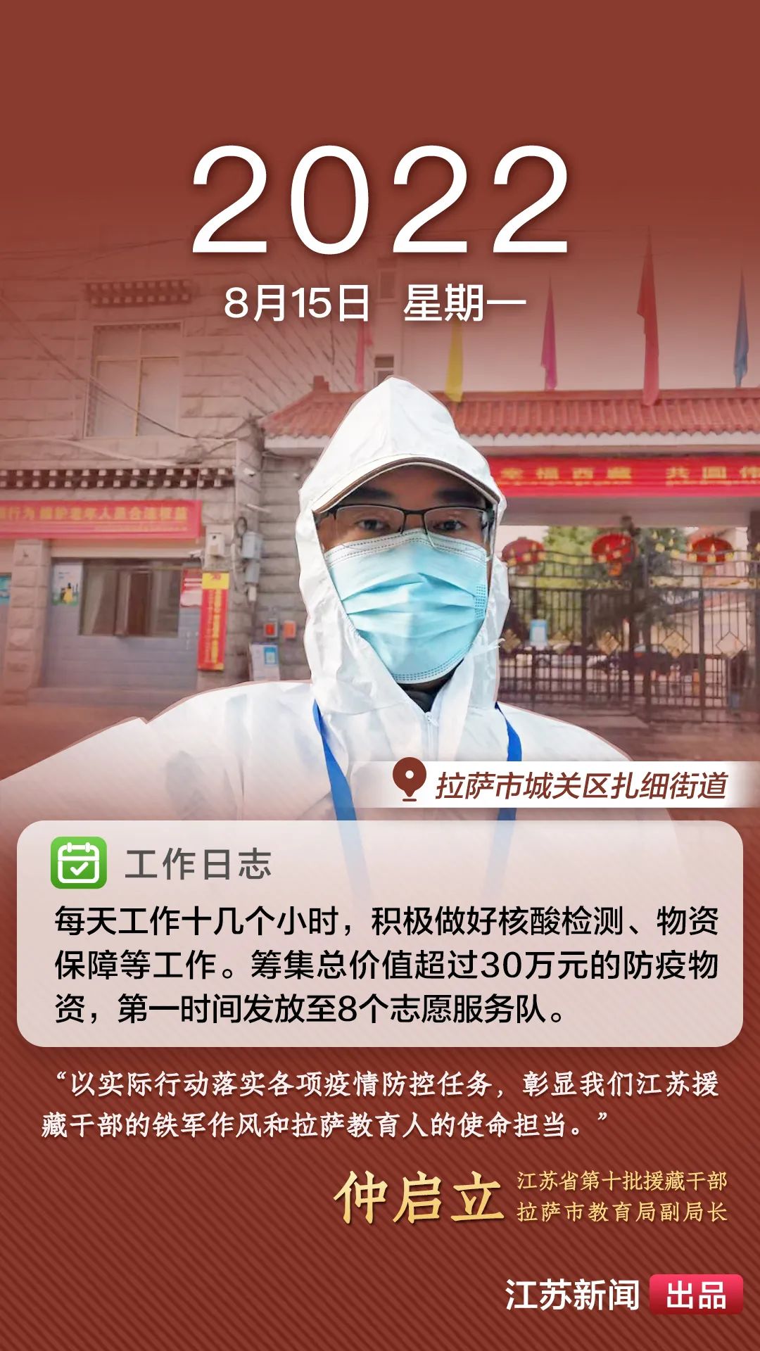 2022年8月,一場突如其來的新冠肺炎疫情襲擊拉薩。江蘇援藏前方指揮部樹立高度的政治意識,堅決貫徹江蘇省委、省政府主要領(lǐng)導批示精神和自治區(qū)、拉薩市部署要求,全力以赴做好疫情防控工作。第十批援藏干部人才克服初到高原的身體反應(yīng),服從服務(wù)大局、勇于擔當作為,迅速投身疫情防控工作一線,以實際行動展現(xiàn)江蘇援藏的鐵軍作風。近期,我們將陸續(xù)推出江蘇援藏干部人才抗疫身影,敬請關(guān)注。