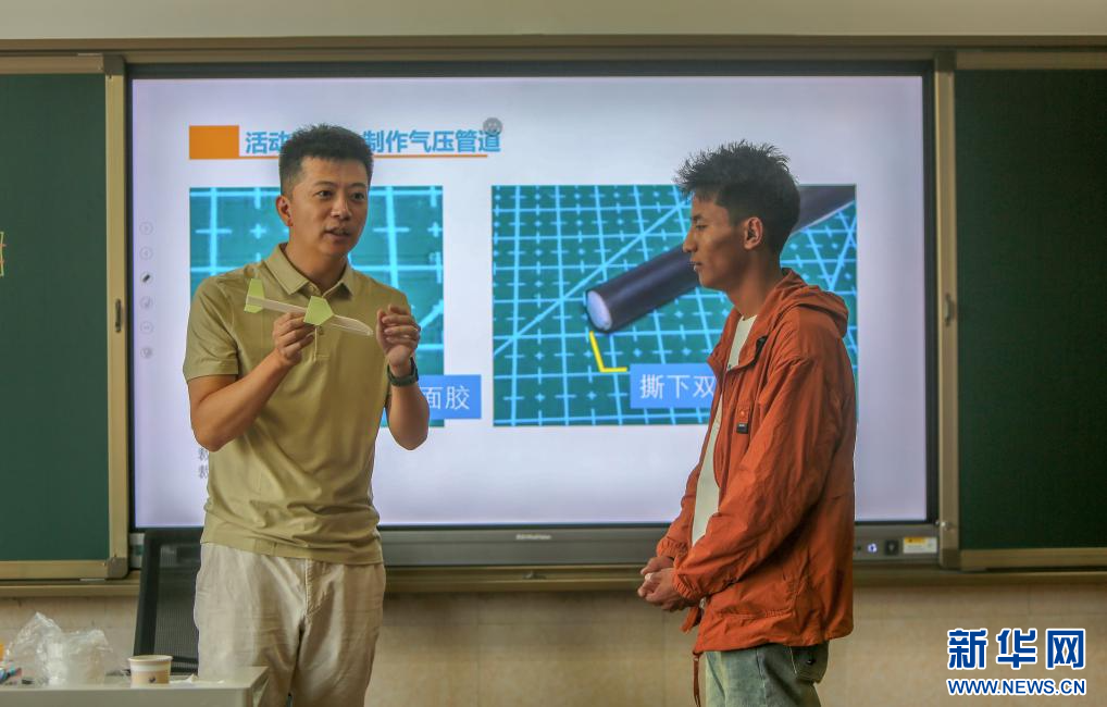 在《航空模型制作》課上,北京市少年宮科技教學部教師張文龍(左)正在與拉薩本地教師進行互動(8月23日攝)。新華社記者 邵澤東 攝