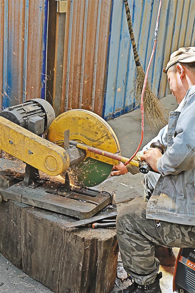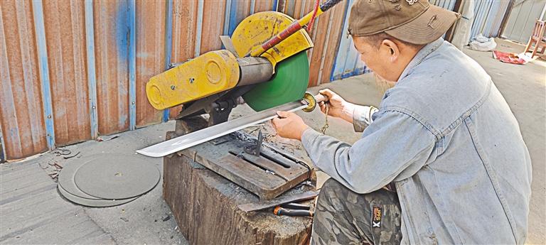 沿著民居錯落的小路攀爬而上,來到江拉村易貢藏刀打制農(nóng)牧民合作社,傳承人西洛正在和線上購買者交流。寬敞的院壩和簡易工作間里,木屑紛飛、火花四濺、錚錚有聲,幾十個村民正在藏刀制作“流水線”上忙碌,一路采訪下來,我們也大致明白了易貢藏刀的制作流程: