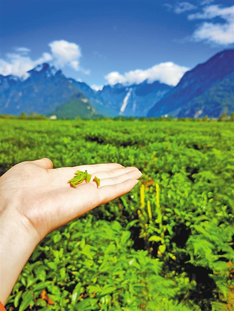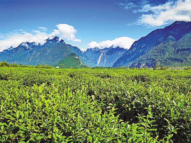 眼前,翠綠欲滴的千畝茶田連接碧色天空,連綿不絕的雪山聳入云霧,清水潺潺的聲音環(huán)繞耳邊,牛羊時不時抬頭望向行人。易貢茶場平均海拔2200米,雖地處青藏高原,但來自印度洋的暖濕氣流沿著雅魯藏布大峽谷進(jìn)入高原,為這片高原茶田帶來豐沛的降水?!岸瑹o嚴(yán)寒,夏無酷暑”,使茶樹能夠在這里茁壯成長。