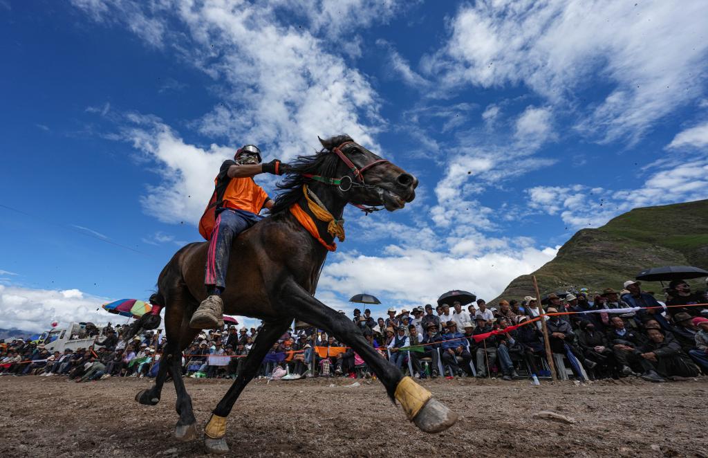 23日,在拉薩林周縣甘旦曲果鎮(zhèn)江角村的賽馬場上,選手邊瑪益丹穿著輕便的馬術(shù)運(yùn)動服,上身貼緊棕色馬背,右手的馬鞭在空中打著旋,和他的愛馬進(jìn)行最后沖刺。