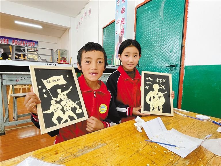 圖為八一建軍節(jié)來臨之際,昌都市芒康縣幫達鄉(xiāng)第三中心小學(xué)學(xué)生制作了主題手工畫,致敬最可愛的人。記者 萬慧 通訊員 廖云路 攝