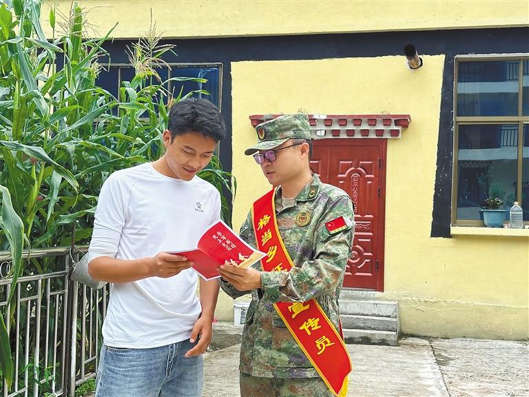 圖為為積極響應(yīng)國家號召,扎實做好征兵工作,墨脫縣格當(dāng)鄉(xiāng)人武部走村入戶向群眾宣傳征兵相關(guān)政策,不斷激發(fā)適齡青年參軍入伍的熱情。這是格當(dāng)鄉(xiāng)人武部部長陳杰到群眾家中進行征兵宣傳。記者 王敏 通訊員 郎玲 攝