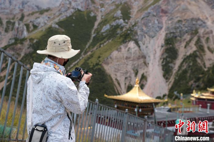 8月20日,參加2024瀾湄國際影像周的中外嘉賓來到青海省玉樹藏族自治州囊謙縣的達(dá)那寺,攝影師拍照留念。達(dá)那寺是囊謙縣唯一一座國家級(jí)文物保護(hù)單位。達(dá)那寺藏語稱為“達(dá)那僧格南宗”,意為“馬耳獅子天堡”,因其坐落之山形似獅子、山上一塊巖石酷似馬耳而得名。中新社記者 薛蒂 攝