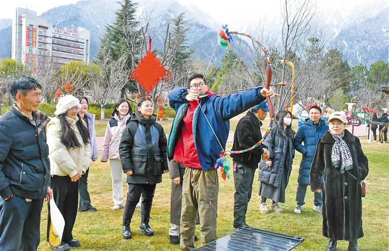 圖為群眾體驗(yàn)工布響箭。記者 劉楓 王珊 攝