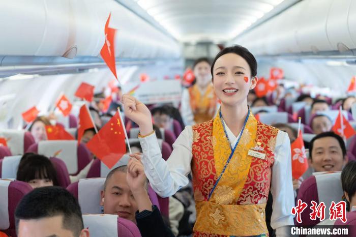 2月19日,西藏航空“拉薩-成都天府-香港”航線開通。圖為航班上舉行首航慶祝儀式?!∥鞑睾娇展﹫D
