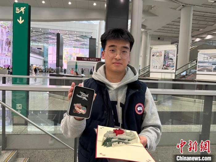 2月19日,西藏航空“拉薩-成都天府-香港”航線開通。圖為首航乘客曾帥向記者展示航空公司派發(fā)的首航紀念徽章和立體賀卡。 中新社記者 韓星童 攝