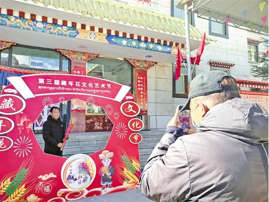 圖為活動(dòng)中,社區(qū)居民與“藏年花”合影留念。記者 拉巴桑姆 攝