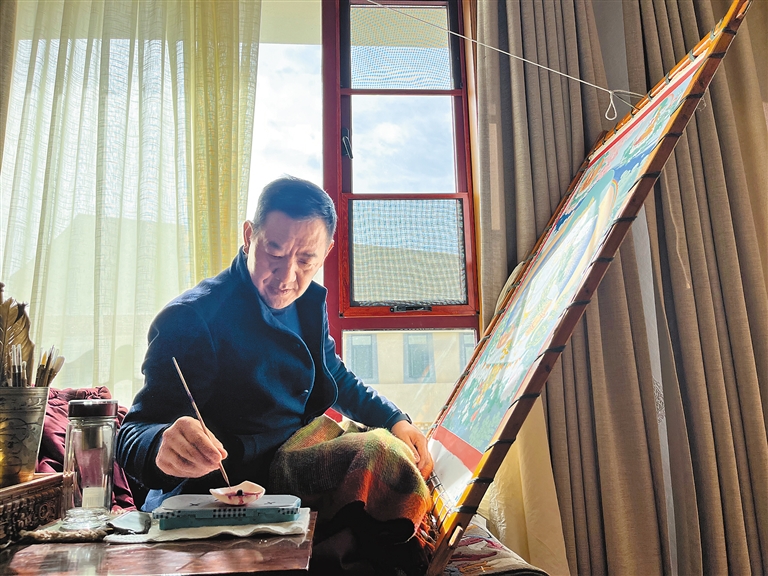 勉沖·羅布斯達在繪制唐卡。記者 丹增平措 次旦央吉 攝
