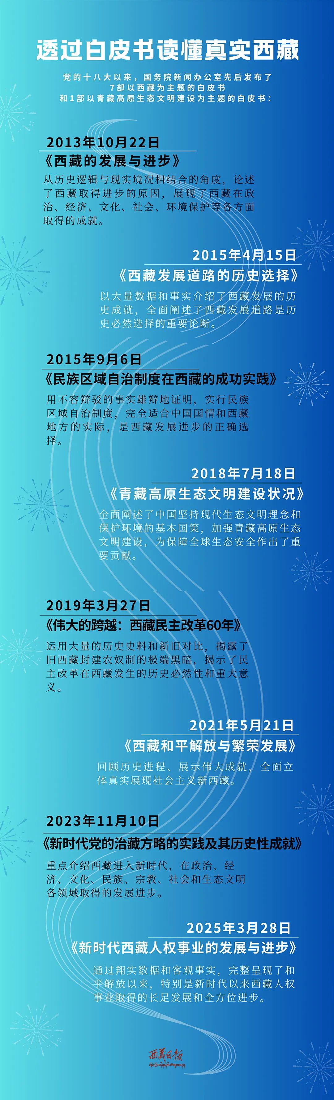 3月28日,國(guó)務(wù)院新聞辦公室發(fā)布《新時(shí)代西藏人權(quán)事業(yè)的發(fā)展與進(jìn)步》白皮書。這也是黨的十八大以來,國(guó)務(wù)院新聞辦公室發(fā)布的以西藏為主題的第七部白皮書。這些白皮書涉及西藏經(jīng)濟(jì)社會(huì)發(fā)展的各方面,真實(shí)地展現(xiàn)了西藏步入發(fā)展最好、變化最大、群眾得實(shí)惠最多的新時(shí)代,各項(xiàng)事業(yè)取得的全方位進(jìn)步、歷史性成就。