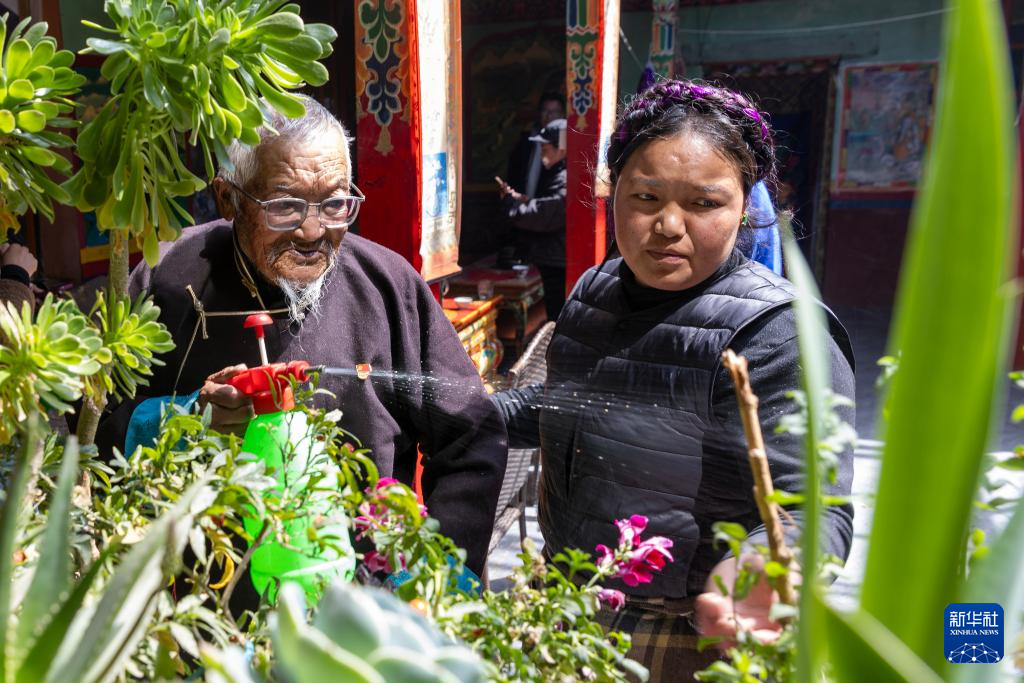 普瓊老人(左)在孫女的陪伴下澆花(3月17日攝)。新華社記者 姜帆 攝