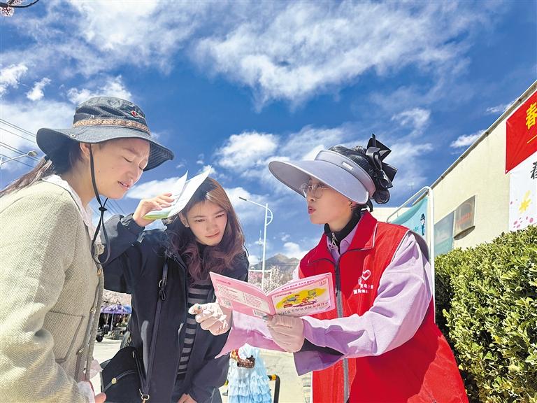 圖為志愿者正在為過(guò)往行人發(fā)放精心制作的家庭安全用電宣傳手冊(cè)。記者 拉巴桑姆 攝