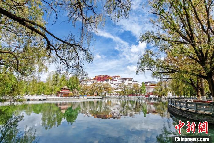 4月,高原古城拉薩一派春景,布達拉宮前后潭水凝碧、柳樹搖青,游客絡(luò)繹不絕。