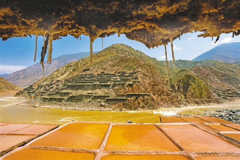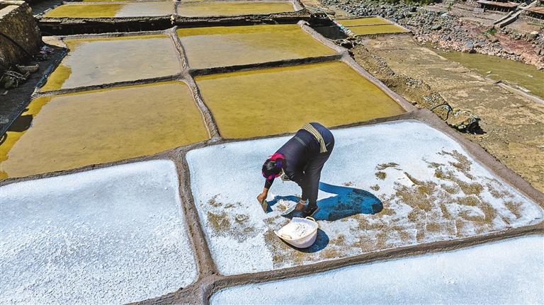 鹽田里,60歲的乃柯正和丈夫一起用木拍夯實(shí)鹽田?!艾F(xiàn)在用泵抽水輕松多了,但拍鹽田的手藝不能丟?!崩先说脑捳Z中,既有對科技的接納,也有對傳統(tǒng)的堅(jiān)守。鹽田下方,鹽晶垂落成簾,在山風(fēng)拂動(dòng)下閃爍微光,仿佛在訴說著什么。一塊塊鹽田如同一面面鏡子,既映照出千年文明的厚重,也折射著鄉(xiāng)村振興的希望。當(dāng)鹽民們輕掃鹽田,他們掃的不僅是晶瑩的鹽,更是一份在傳承與創(chuàng)新中守護(hù)的鄉(xiāng)愁。