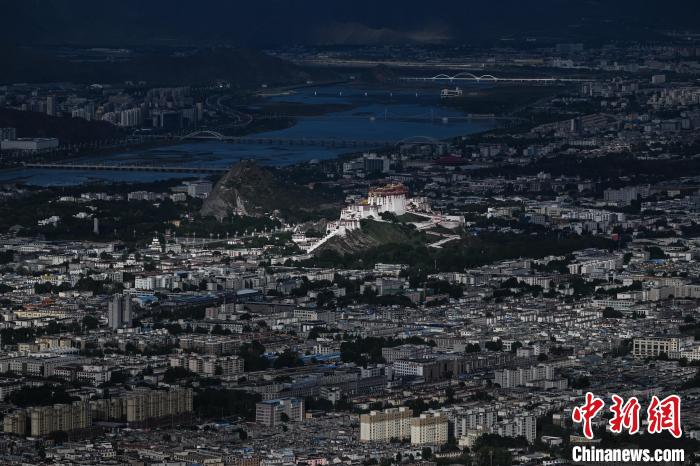 7月5日清晨,西藏拉薩市在薄霧中朦朧蘇醒,天際線泛起粉紫色霞光。布達拉宮在朝陽的映照下美景如畫。中新社記者 貢嘎來松 攝