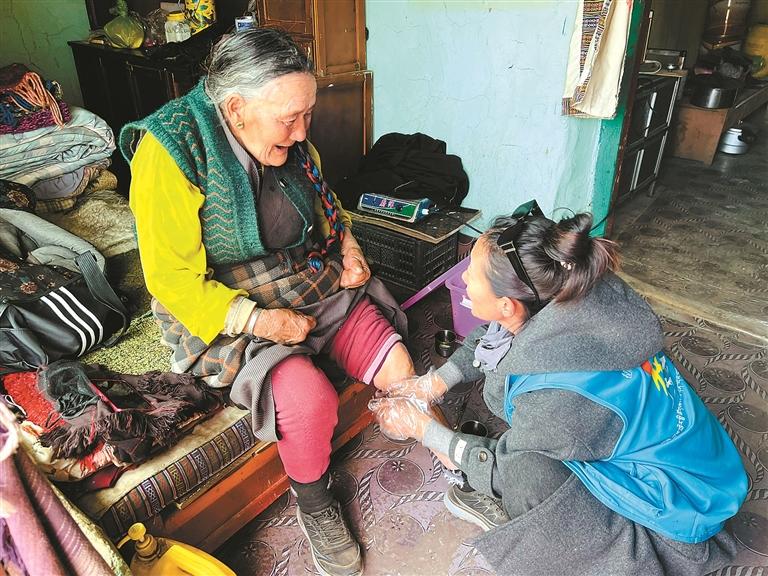 清晨的陽光灑在林周縣春堆鄉(xiāng)卡東村的土路上,林周縣民政服務(wù)站工作人員旦增旺姆背著裝滿蔬菜和藥品的布袋,熟門熟路地走進(jìn)仁增拉卓老人的院子。“阿媽啦,今天給您帶了新鮮的蘿卜,再把降壓藥給您續(xù)上?!?3歲的仁增拉卓顫巍巍迎上來,拉著旦增旺姆的手笑得眼角堆起皺紋——這樣的清晨探望,早已成為老人日常生活里的“定心丸”。