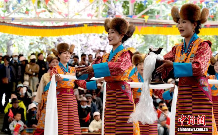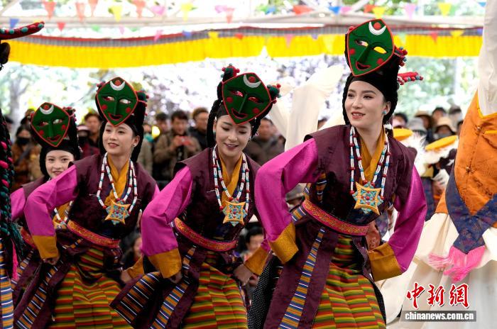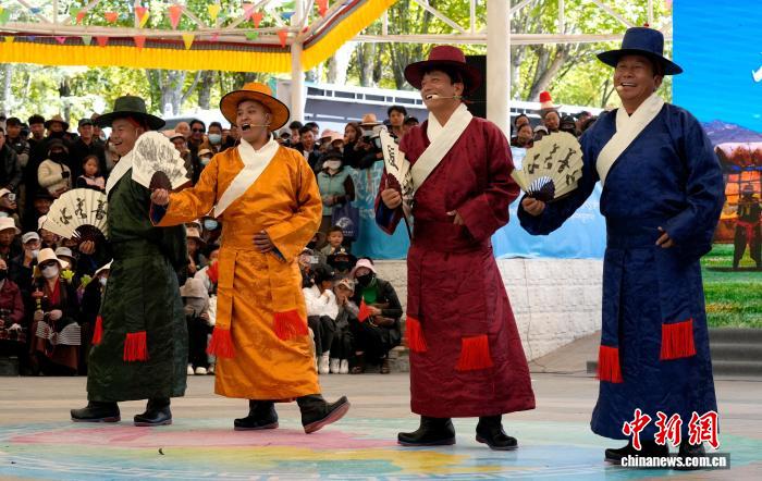 10月19日,“格?;ū崩_市第六屆縣(區(qū))藝術(shù)團(tuán)文藝調(diào)演頒獎活動在布達(dá)拉宮腳下的宗角祿康公園舉行。現(xiàn)場,拉薩市各縣(區(qū))藝術(shù)團(tuán)帶來精彩節(jié)目。圖為文藝調(diào)演頒獎活動上的文藝表演。中新社記者 李林 攝