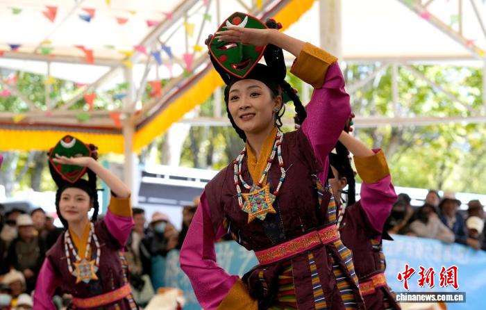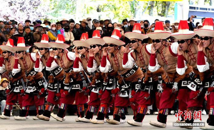 10月19日,“格?;ū崩_市第六屆縣(區(qū))藝術(shù)團(tuán)文藝調(diào)演頒獎活動在布達(dá)拉宮腳下的宗角祿康公園舉行?,F(xiàn)場,拉薩市各縣(區(qū))藝術(shù)團(tuán)帶來精彩節(jié)目。圖為文藝調(diào)演頒獎活動上的文藝表演。中新社記者 李林 攝