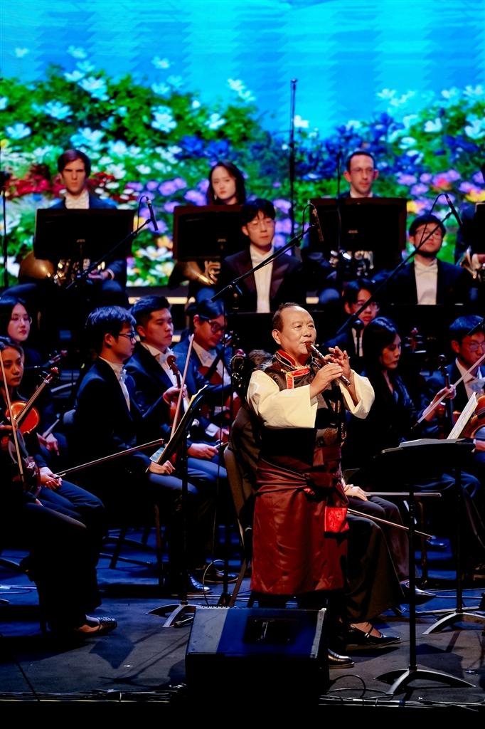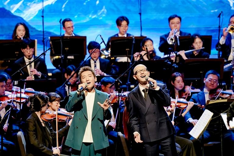 藝術(shù)形式的創(chuàng)新融合是本次音樂會的一大亮點。二重唱《茉莉與格?!穬?yōu)美詮釋了民族文化的交流共生;器樂演奏《“飛弦踏春”與“賽馬”》則讓著名二胡演奏家陳軍的激昂琴聲與扎念琴演奏員措姆的熱情彈奏展開對話,碰撞出令人振奮的藝術(shù)火花。從展現(xiàn)拉薩當代生活的電視劇插曲《藍天上的云》,到描繪鄉(xiāng)村振興新貌的《童話里的格林村》,再到融合原生態(tài)山歌與專業(yè)唱法、曾為中央代表團獻唱的《珠穆朗瑪》,一系列新創(chuàng)作品生動展現(xiàn)了傳統(tǒng)與現(xiàn)代交織、充滿活力的社會主義新西藏。