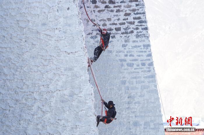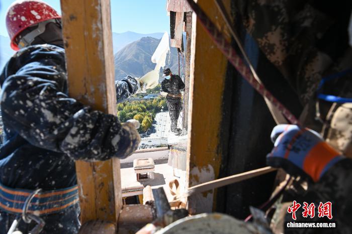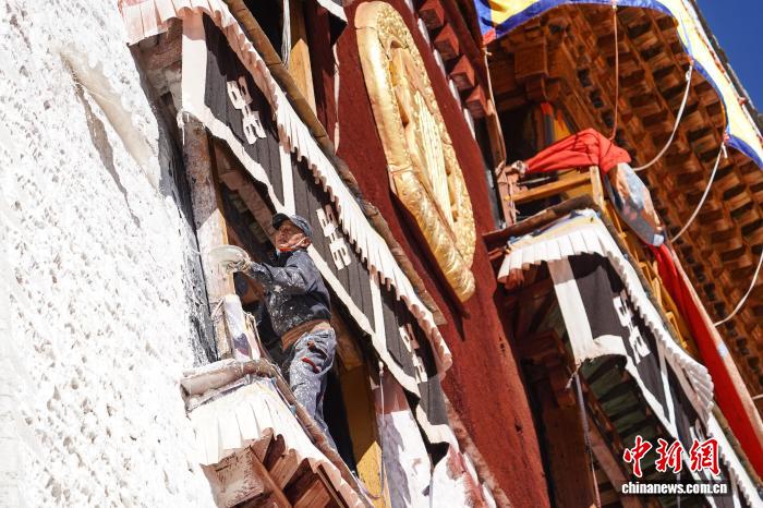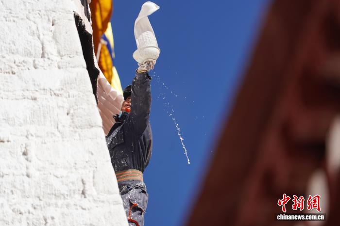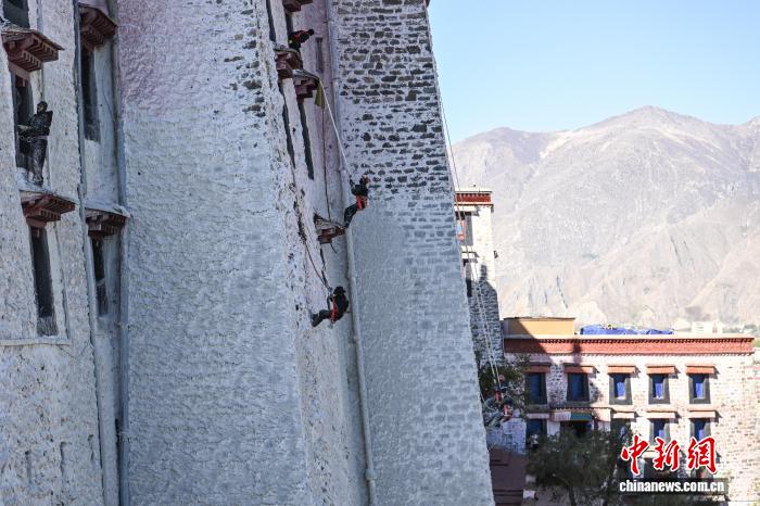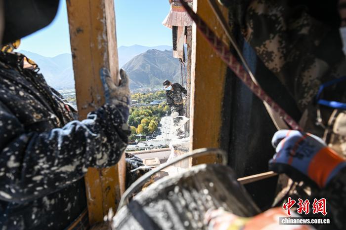 10月22日,西藏拉薩,布達拉宮管理處的工作人員和拉薩信眾自發(fā)參與其中對宮墻、窗框進行整體粉刷,為布達拉宮“年度美容”。當日,布達拉宮迎來了一年一度的粉刷季。圖為工作人員對布達拉宮外墻噴灑涂料。中新社記者 貢嘎來松 攝