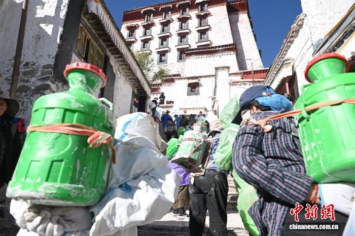 10月22日,西藏拉薩,布達拉宮管理處的工作人員和拉薩信眾自發(fā)參與其中對宮墻、窗框進行整體粉刷,為布達拉宮“年度美容”。當日,布達拉宮迎來了一年一度的粉刷季。圖為拉薩信眾排隊搬運布達拉宮粉刷使用的涂料。中新社記者 貢嘎來松 攝