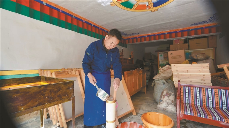 走進(jìn)墨竹工卡縣唐加鄉(xiāng)羅杰林民族手工藝品加工專業(yè)合作社,記者發(fā)現(xiàn),里面竟別有洞天,擺滿了各種顏色的藏紙,有的鮮艷奪目,有的相對(duì)淡雅。為了更加美觀,部分彩色藏紙上還印有文字和圖案。房間的另一邊則擺放著由各種顏色的藏紙加工而成的筆記本、筆筒、抽紙盒等種類豐富、款式新穎的工藝品。拉薩市市級(jí)非物質(zhì)文化遺產(chǎn)第五代直貢嘎秀藏紙技藝傳承人覺康就啊·阿旺曲央正帶領(lǐng)徒弟們調(diào)試新研發(fā)的藏紙染料——經(jīng)改良后的藏紙呈現(xiàn)出細(xì)膩的皮質(zhì)質(zhì)感,兼具傳統(tǒng)韻味與現(xiàn)代審美,讓這門擁有近千年歷史的非遺技藝,在守護(hù)與創(chuàng)新中點(diǎn)亮了當(dāng)?shù)厝罕姷脑鍪章贰?/p>
